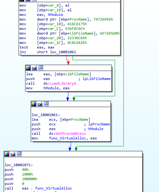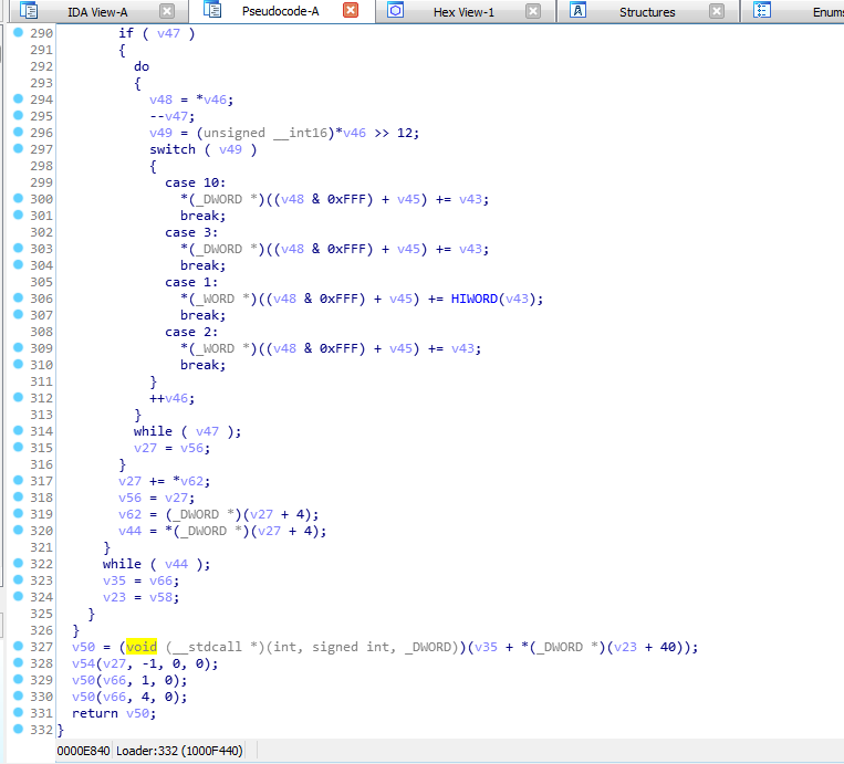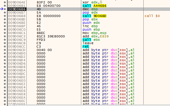 与meterpreter一样,是一个reflective dll loader,事先已计算好Loader函数与当前指令地址的偏移。call ebx处,即是call Loader
