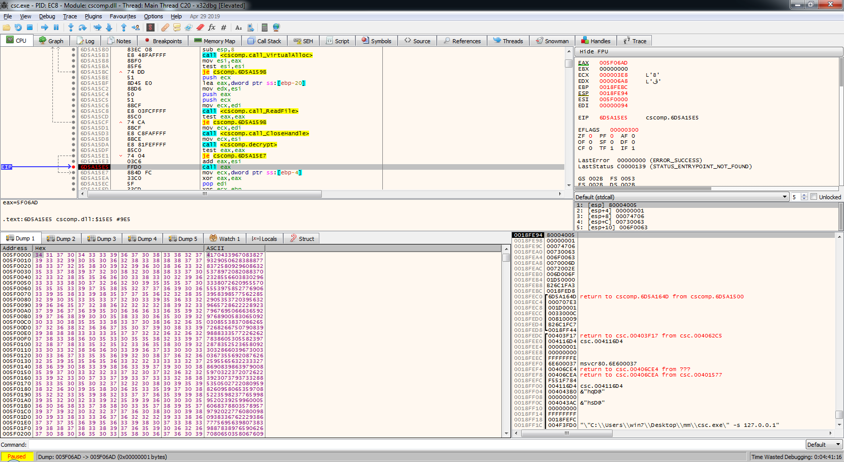 其中,csc.exe是微软.net组件,Visual C# Command Line Compiler;cscomp.dll为恶意DLL,利用DLL劫持,使csc.exe启动时被调用;cscomp.rom是一个加密文件。