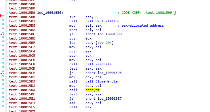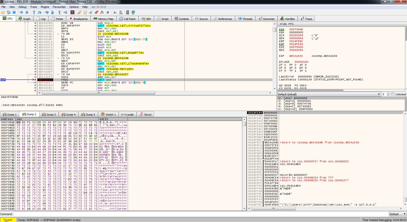 VirtualAlloc分配内存,读取cscomp.rom内容,解密后通过call eax进入解密代码