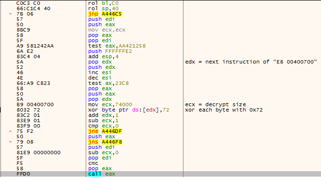 解密算法为,从E8 00400700指令的下一条指令开始,xor 0x72,共0x74000 bytes