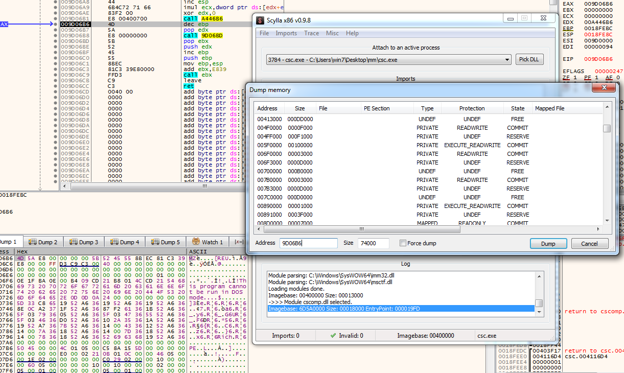 看到4D,5A了,用Scylla插件把这部分内存DUMP出来(此处地址与前面不一样,是因为不小心跑飞了)