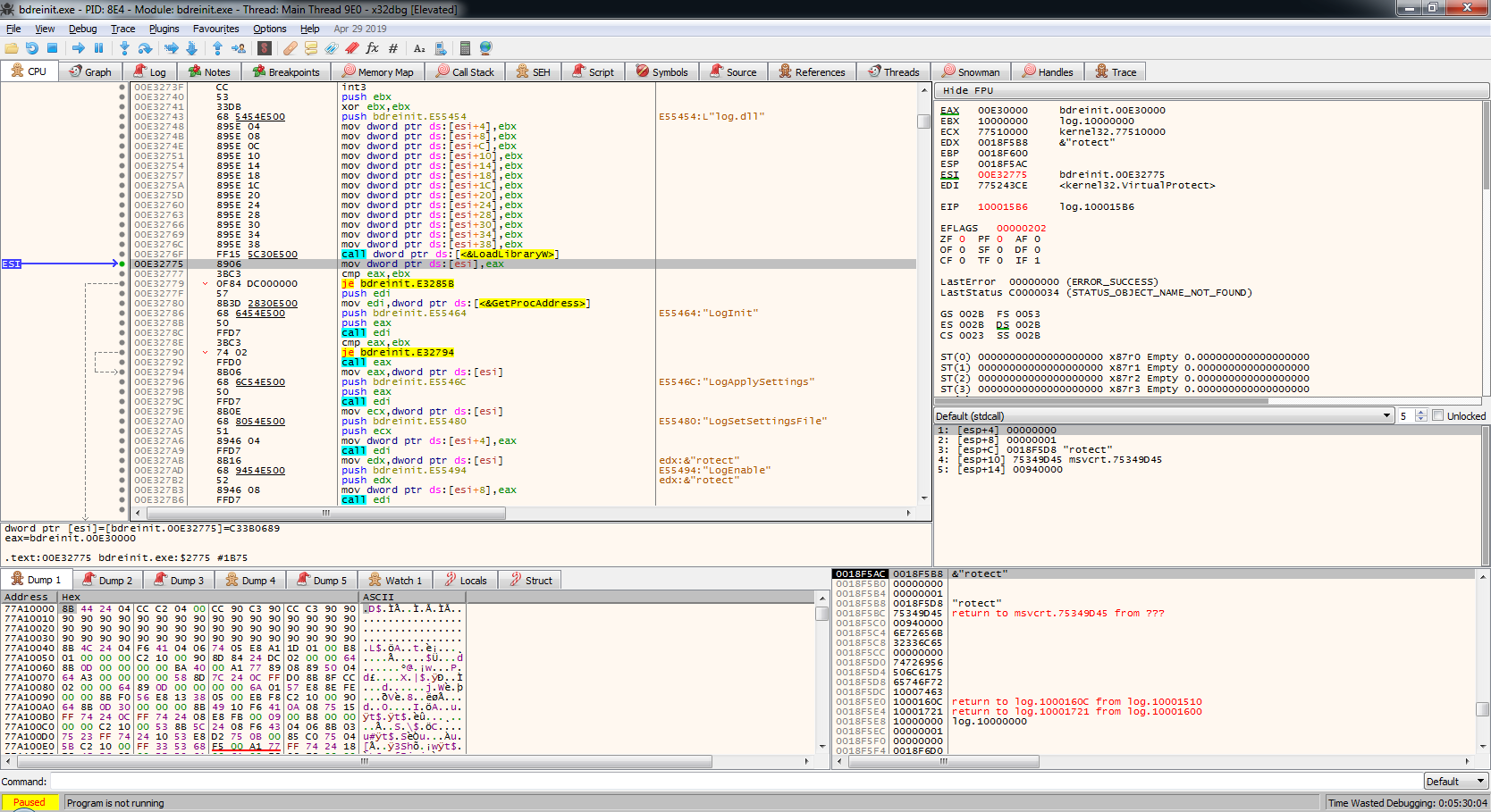 分析DllMain,发现只是将bdreinit.exe进程基址+0x2775偏移处的6个字节修改为