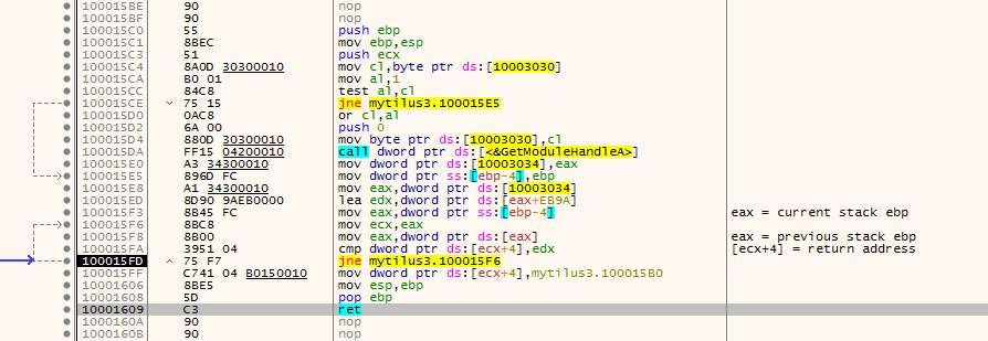 首先获取LoadLibrary的下一条指令的地址,然后通过栈回溯查找返回地址,如果匹配则修改为劫持函数的地址